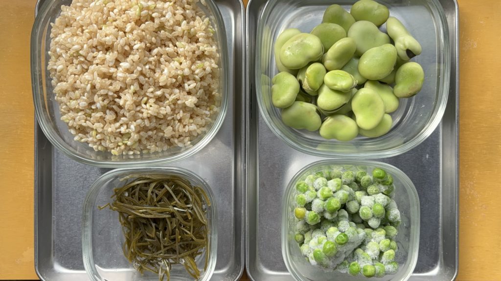 玄米の淡いベージュに、そら豆の柔らかな緑と、グリーンピースのはじけるような鮮やかさがよく映えます。