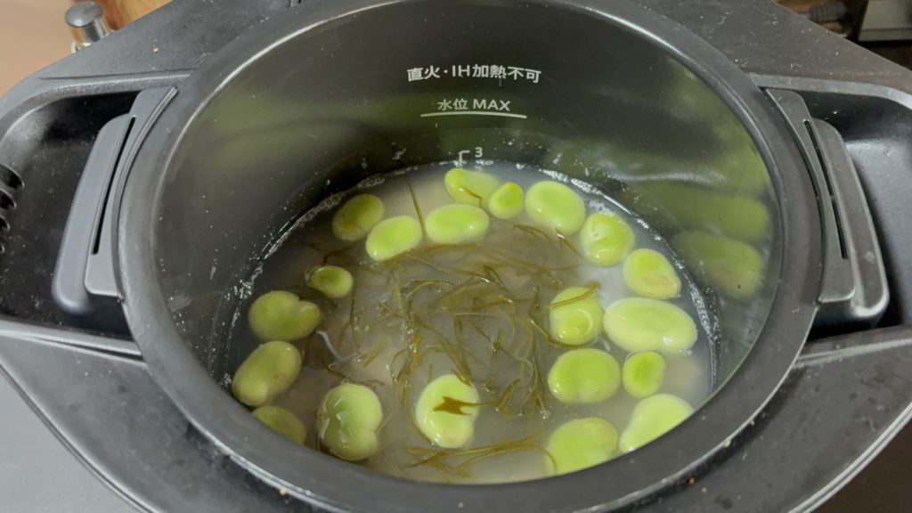 炊き上がる瞬間、ふわっと立ちのぼるのは、昆布のふくよかな香りと、そら豆の青々しくも甘やかな香り。