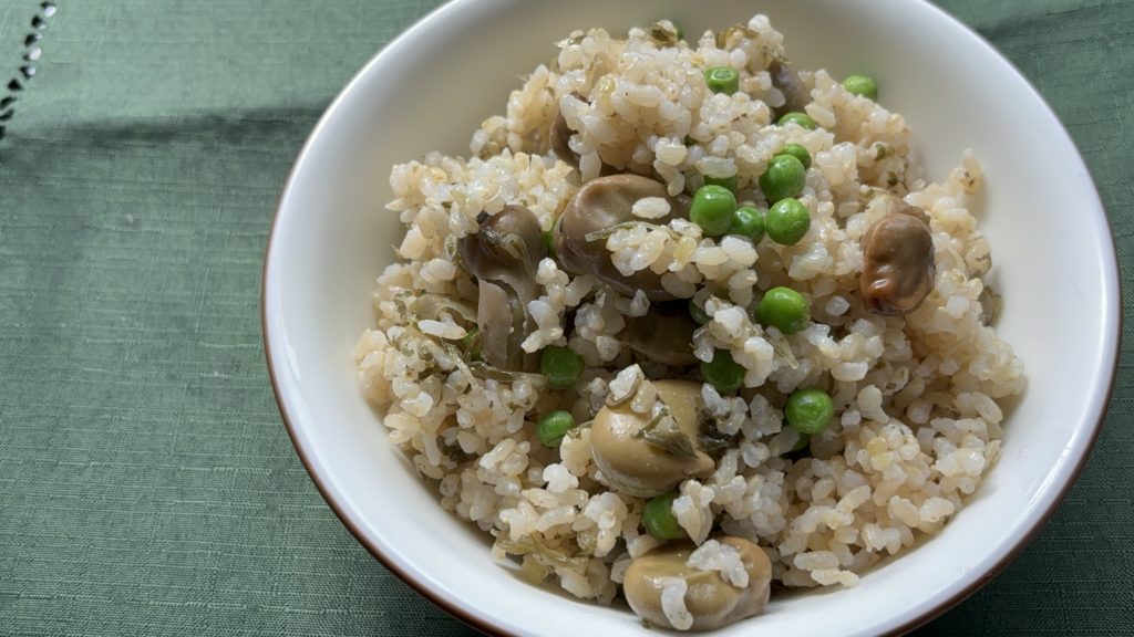 今日は、ふっくらと炊き上がった玄米に、そら豆とグリーンピースの瑞々しい彩りが映える「そら豆の玄米炊き込みご飯」をご紹介します。