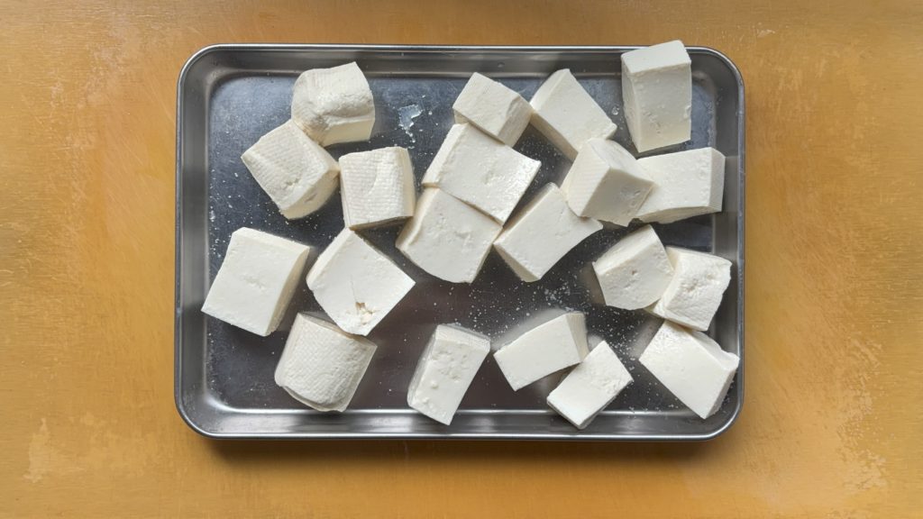 豆腐はレンジで水切りをして、2.3cm角に切り、塩をまぶす