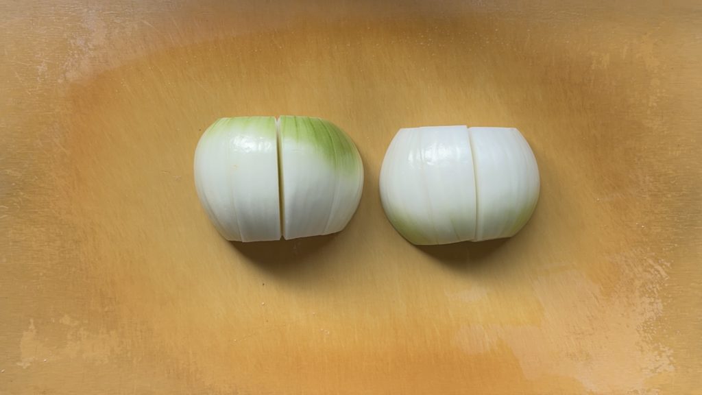玉ねぎは縦半分に切り、4等分のくし形切りにする