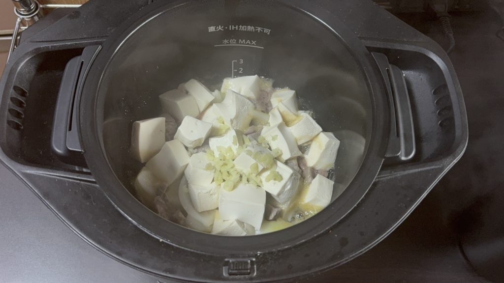 豆腐、にんにくを入れる