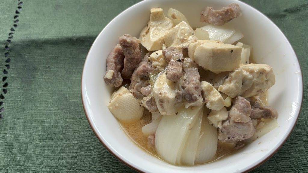 お皿に盛ると、ほっこりした豆腐の白、透明感のある玉ねぎのやさしい色合い、そしてほんのり焼き色がついた豚肉がひとつに。