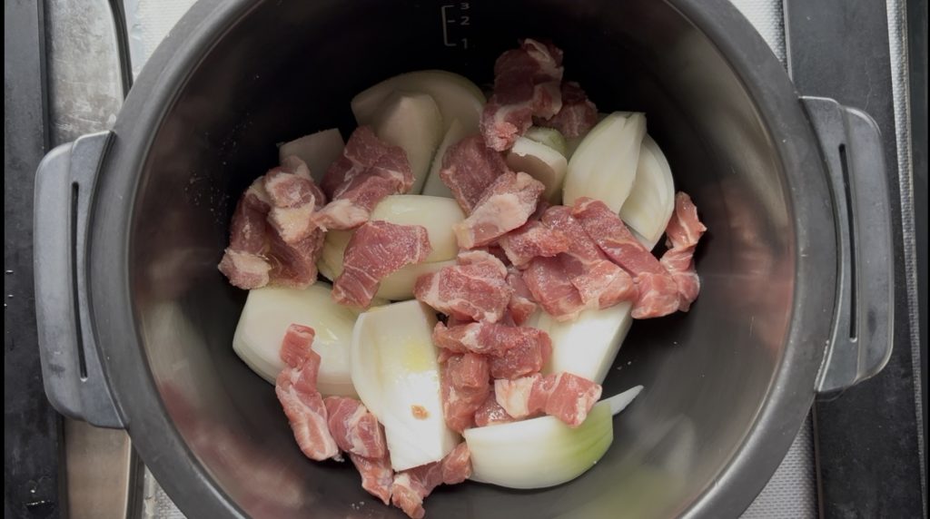 鍋に玉ねぎ、豚肉、オリーブオイル、塩の順に入れ、軽くかき混ぜる