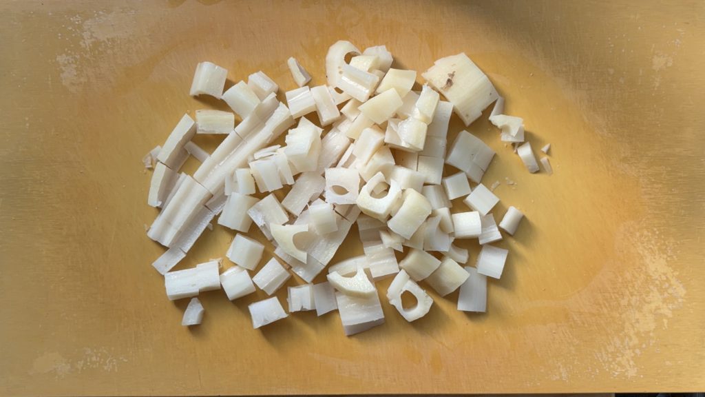 れんこんは皮を剥いて、1cm角に切る