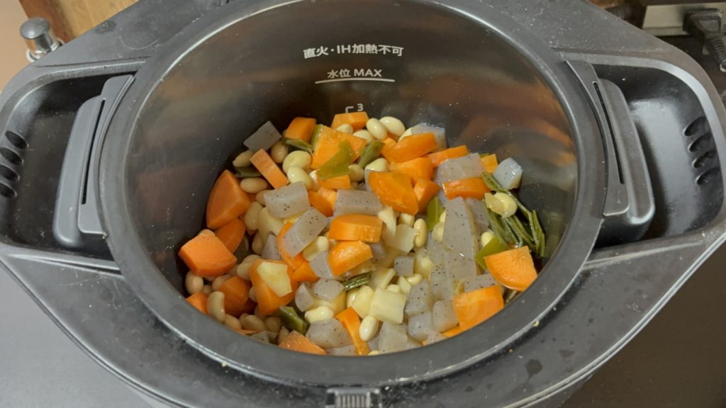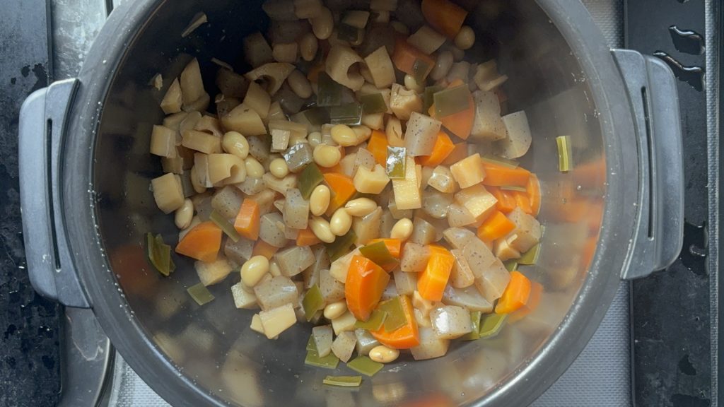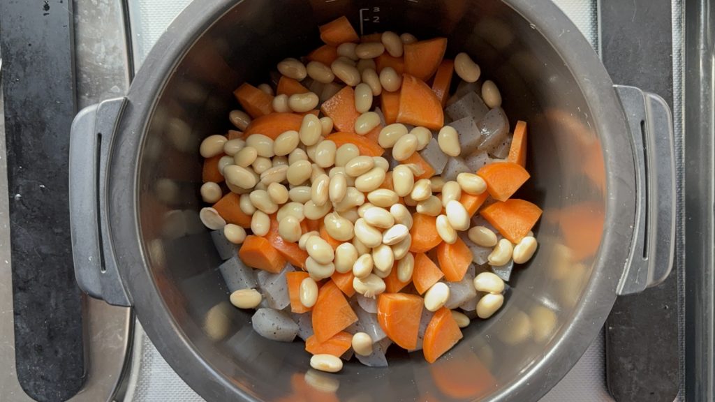 大豆、にんじんの順に入れる