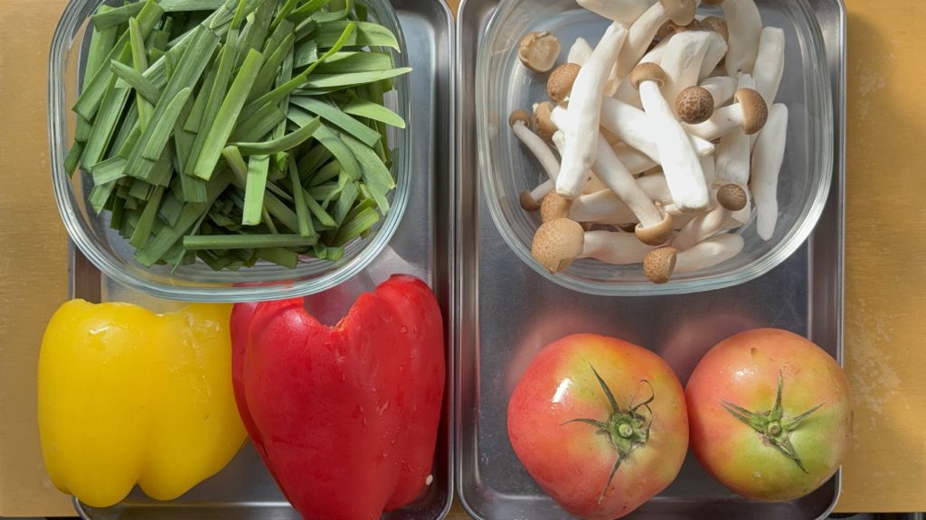 火を通すことで甘みと酸味がぎゅっと凝縮されたトマト、シャキッと歯ざわりが楽しい赤・黄パプリカ、香り高いにらが織りなすカラフルな夏の一皿。
