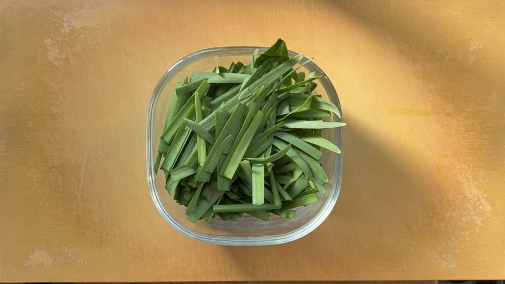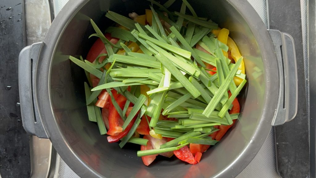 調理終了後、春雨、残りのにら、豚肉を加え、軽くかき混ぜる
