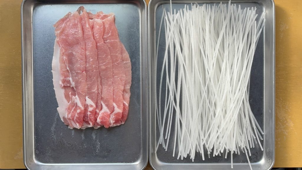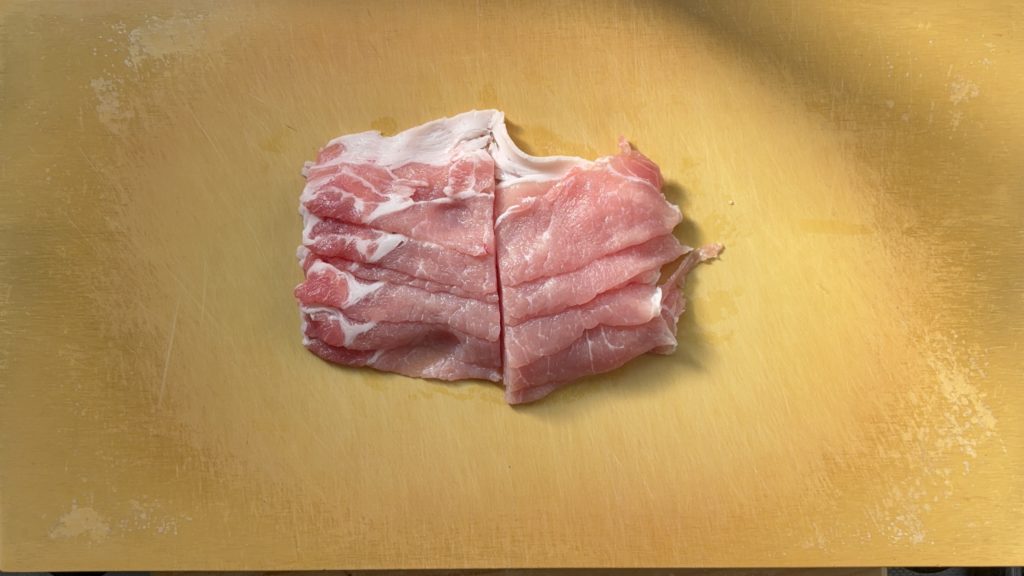 豚ロース肉しゃぶしゃぶ用を使うことと、調理終了後の2分間だけ豚肉を加熱することで柔らかくし上がっています。