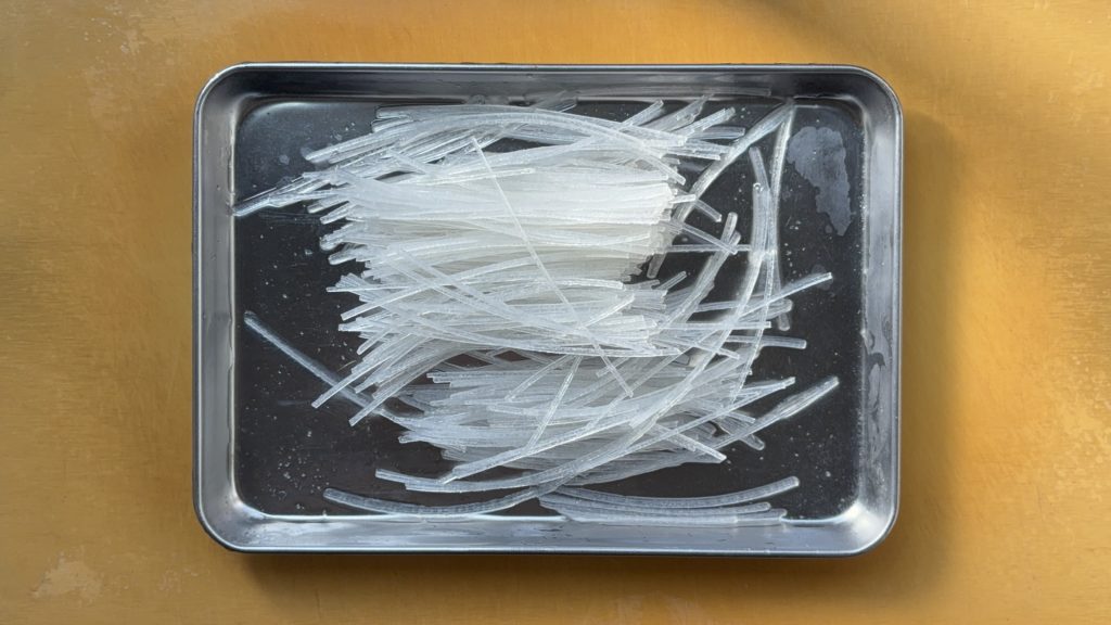 春雨はお湯に3分ほどさらし、半分に切り水気を切る
