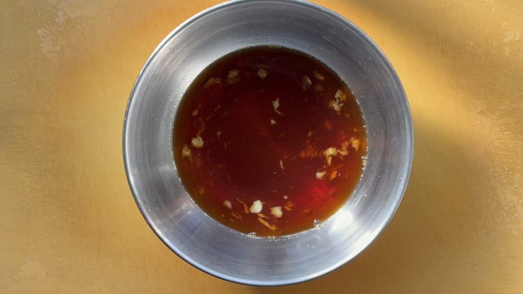 ボウルにチキンストック、醤油、フラクトオリゴ糖、にんにくを入れ、混ぜ合わせ、合わせ調味料を作る