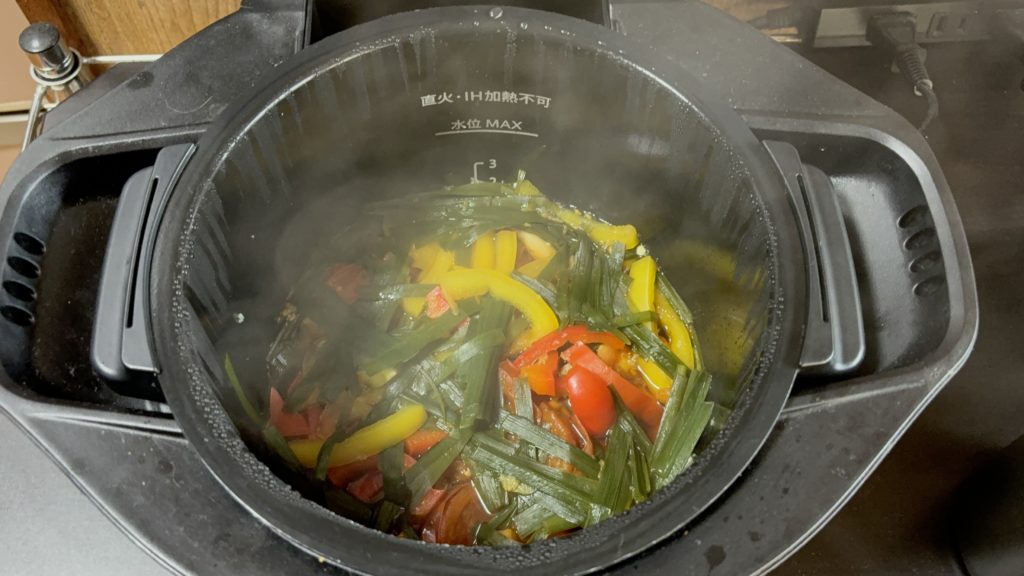 全体の調理時間は35分ほどかかります。材料の下ごしらえに10分、ホットクックの加熱が25分ほどです。