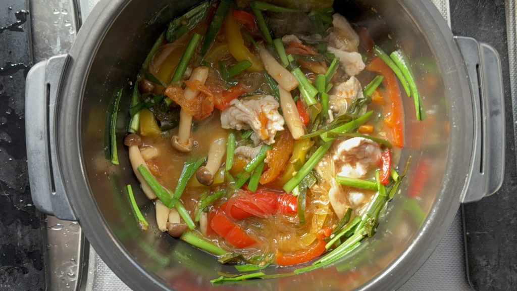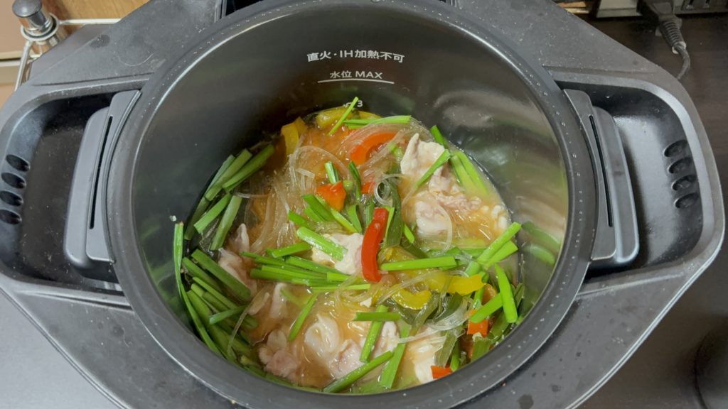 4.調理終了後、春雨、にら、豚肉はを加え、2分調理延長する