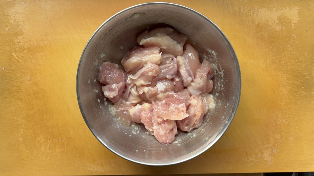 鶏肉は一口大に切り、塩麹を揉み込み、30分ほど置いておく
