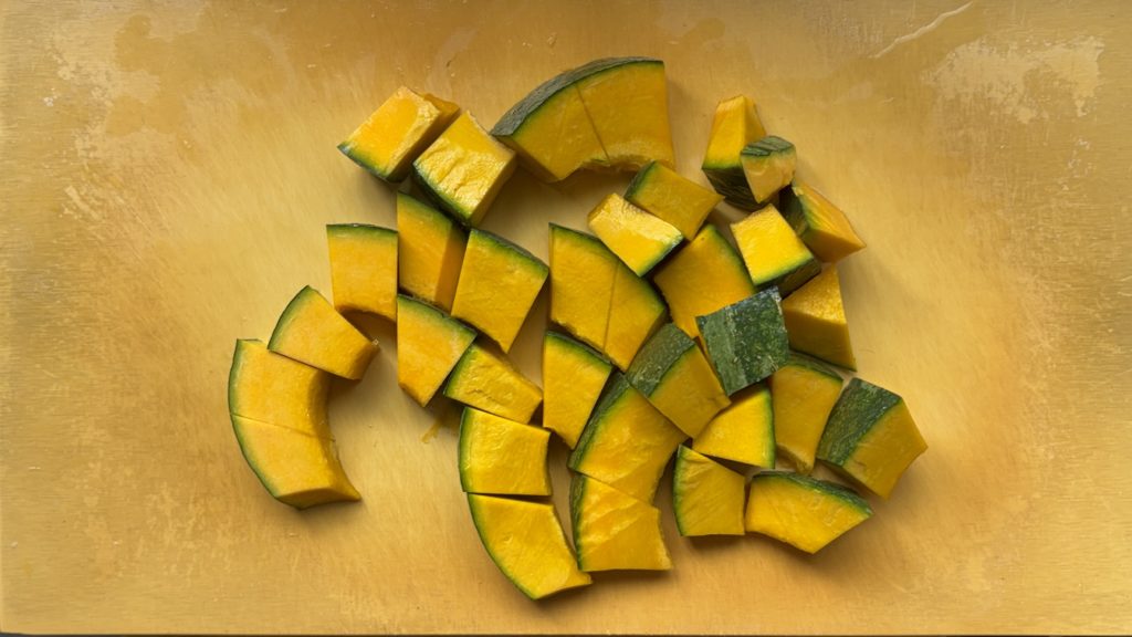 かぼちゃはワタと種を取り除き、2.3cm角に切る