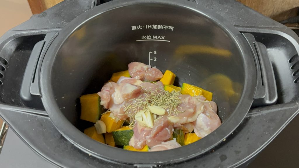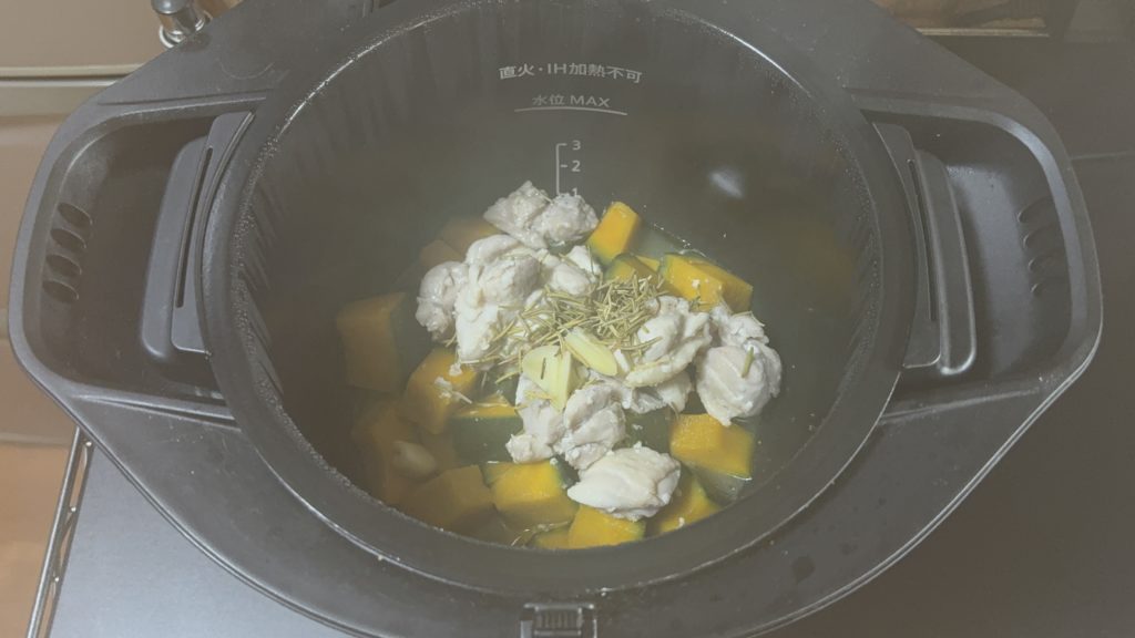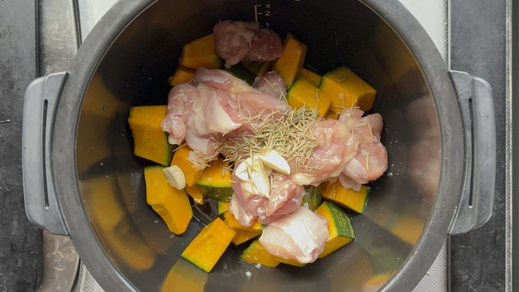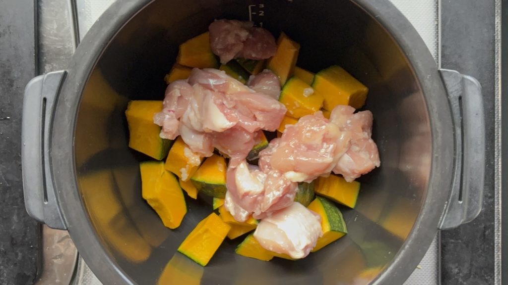 鍋にかぼちゃ、鶏肉の順に入れる