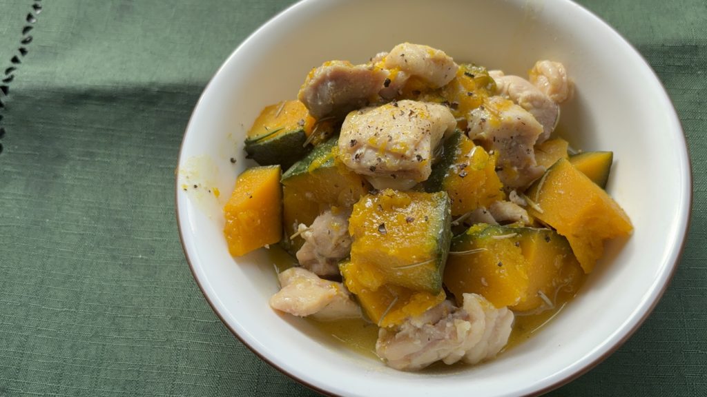 仕上げにブラックペッパーを振れば、鮮やかなオレンジ色のかぼちゃと、しっとり照りのある鶏肉の上に、黒いドット模様がアクセントに。