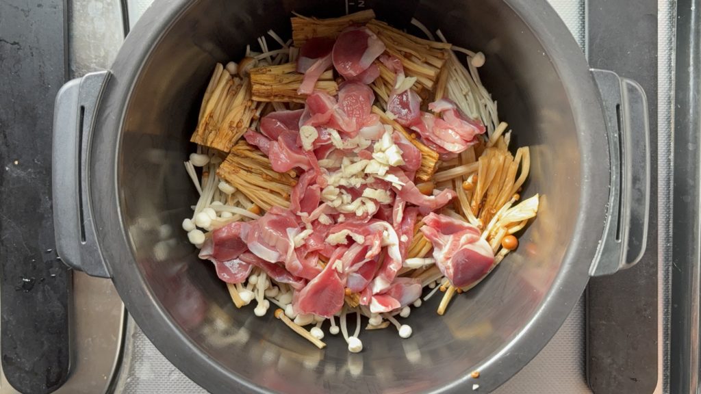 白と茶色の2種のえのきが織りなす、ナチュラルなグラデーション、淡いピンクがかった砂肝のアクセントカラー、そして、最後に加える水菜の鮮やかな緑がパッと全体を引き締めます。