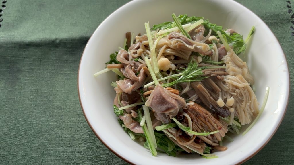 今回紹介するのは「2種のえのきと砂肝水菜のナムル」!