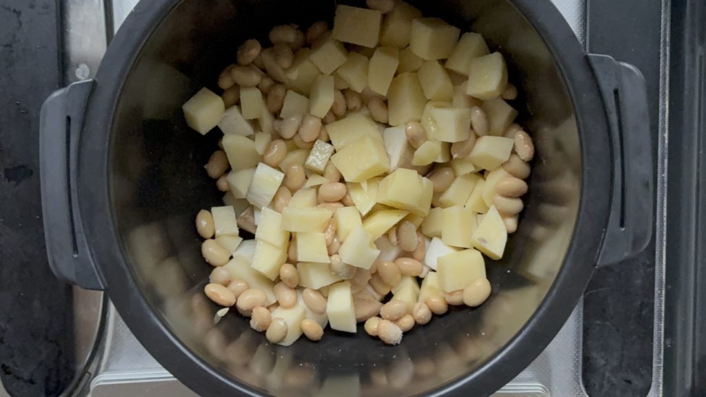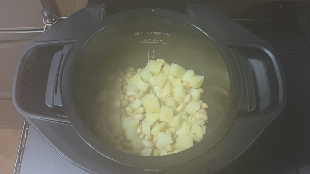 鍋にエリンギ、じゃがいも、大豆の順に入れる
