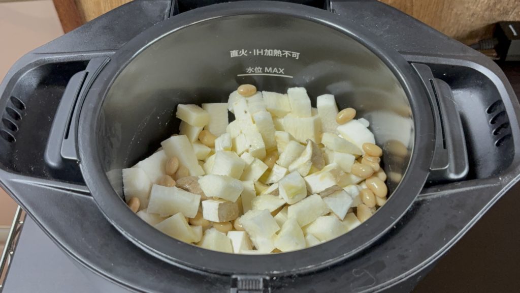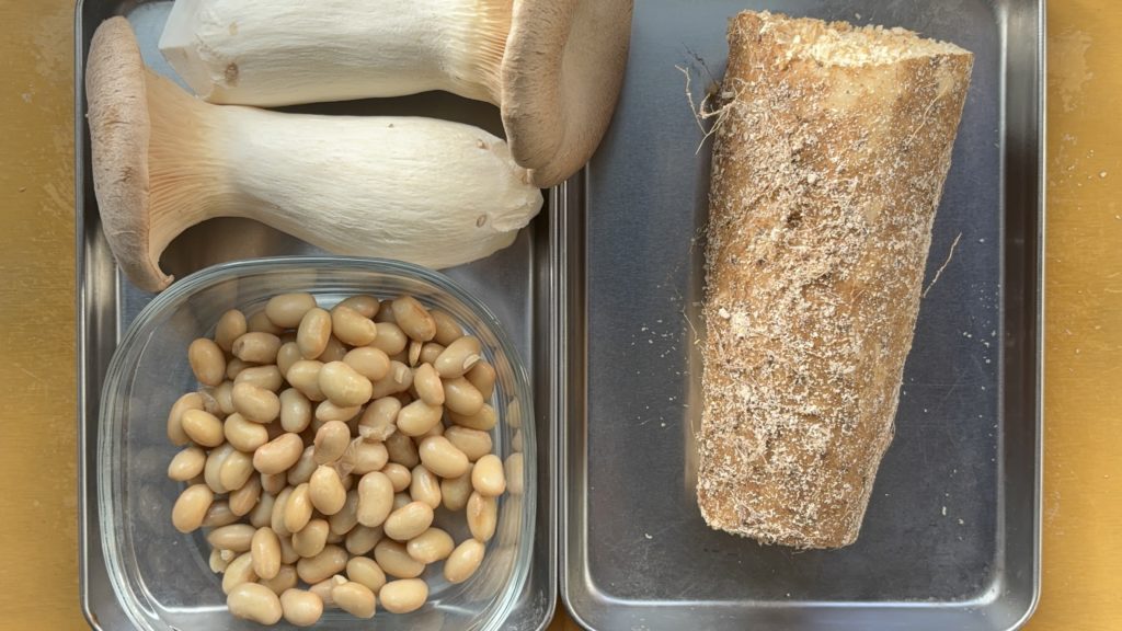 しっかりとした歯ごたえのあるエリンギに、ねっとりシャクシャクした長芋、そしてほくほくとしたじゃがいもと大豆。