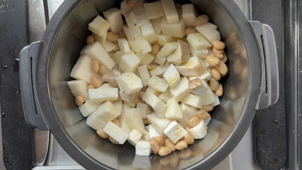 長芋のシャキねば食感、エリンギのプリッとした弾力、大豆とじゃがいものほくほく感。噛むたびに変化があって、飽きずに食べられます。