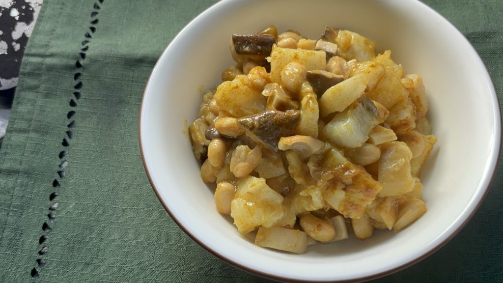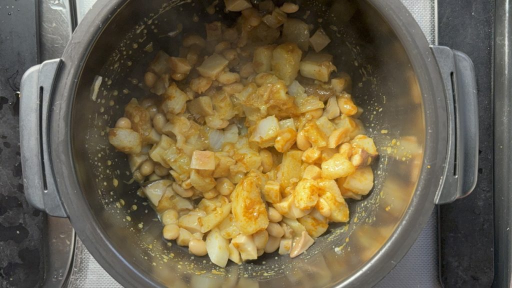カレー粉の黄色が全体にほんのり染みわたり、そこにエリンギの淡いベージュ、大豆の優しい黄味、そしてじゃがいもの自然な色味が加わって、温かみのある一皿に。