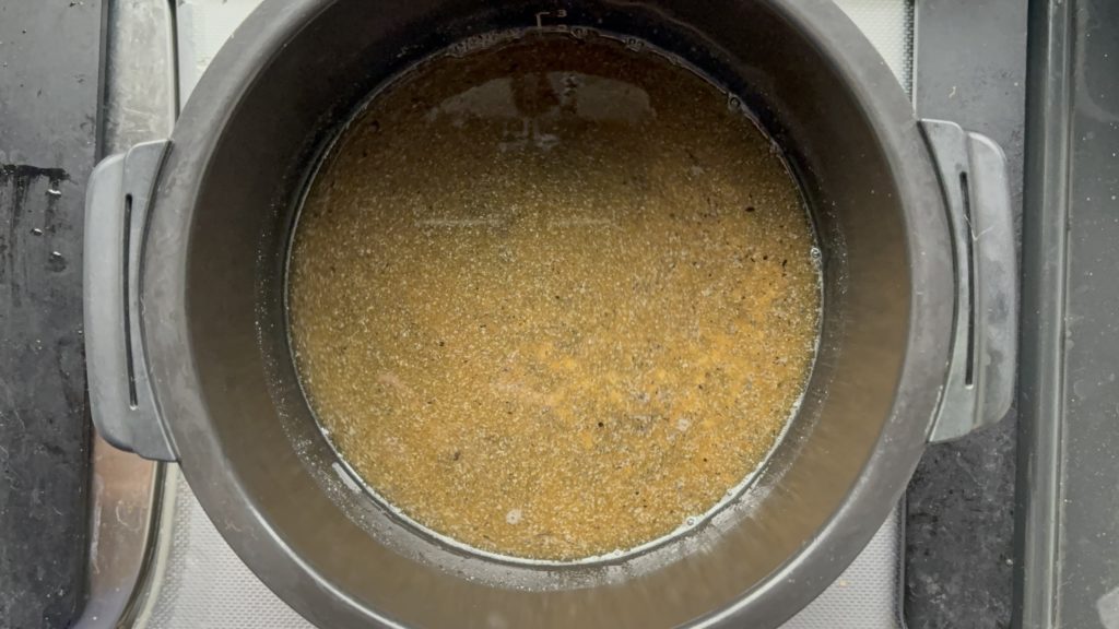 2合の目盛りまでチキンストックを注ぎ、全体をよくかき混ぜる