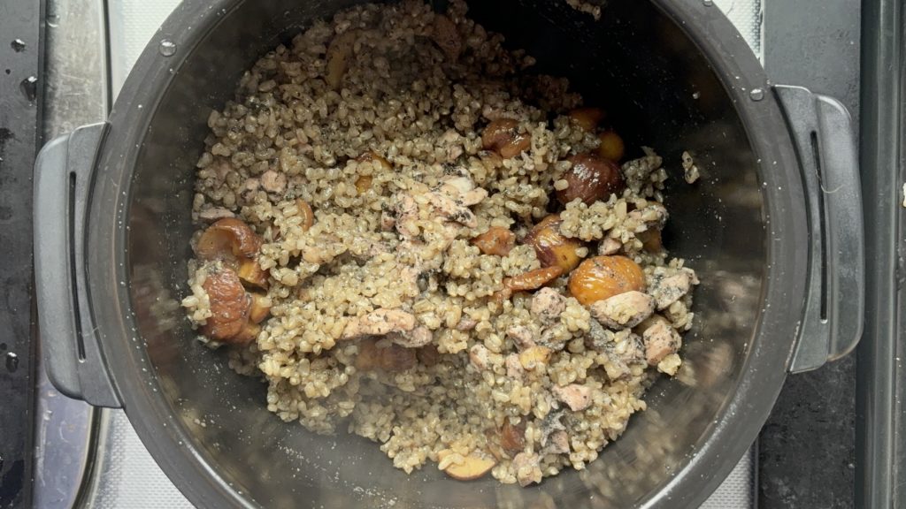 玄米のぷちぷち感と栗のほっくりした柔らかさが心地よく、そこに鶏肉のしっとりとした弾力が加わります。炊き込みご飯ながらも、ひと口ごとに異なる食感が楽しめ、噛むほどに素材の個性が際立ちます。