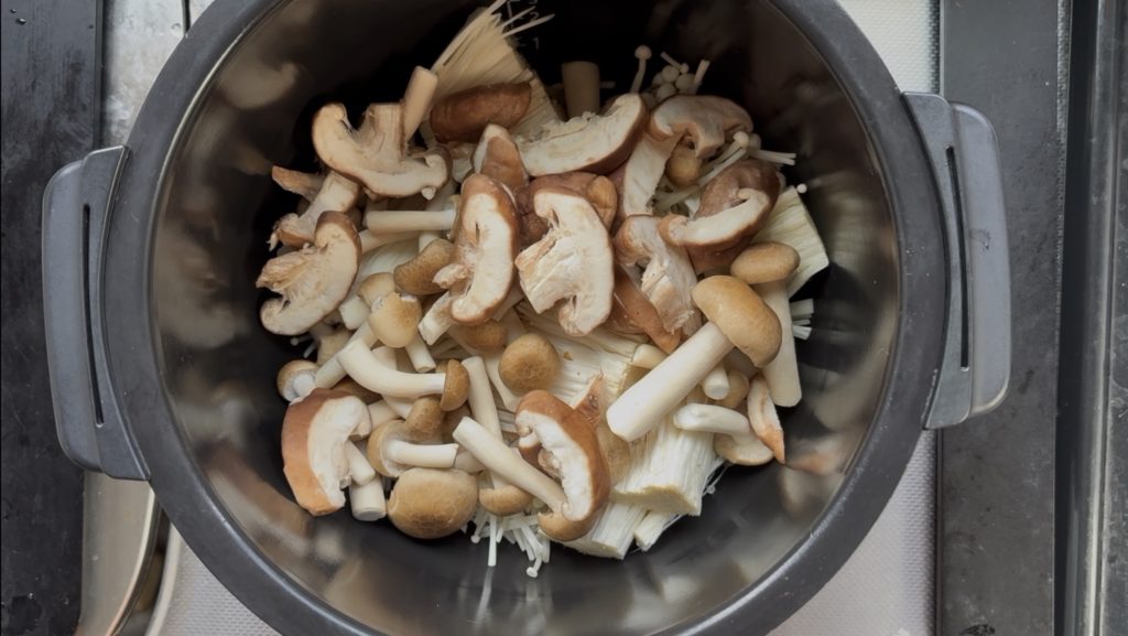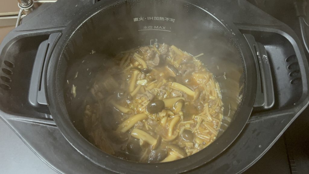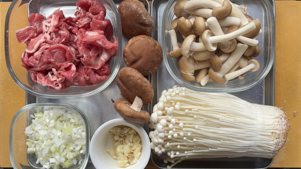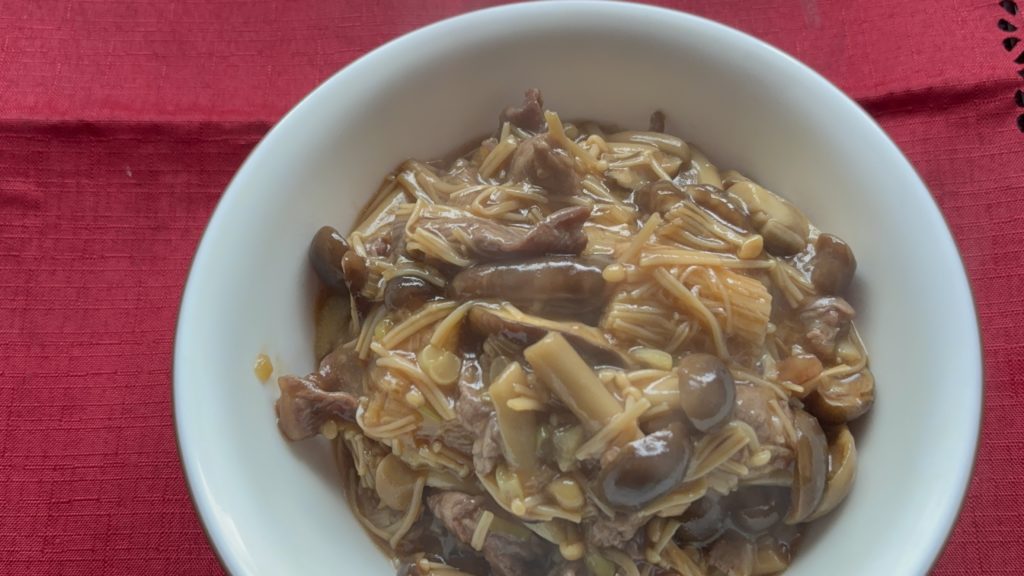 しめじのぷりっと感、えのきのシャキッと感、しいたけの肉厚な歯ごたえがそれぞれの個性を出しています。牛肉はやわらかく、片栗粉のおかげでタレがしっかり絡み、つややかな食感に仕上がります。