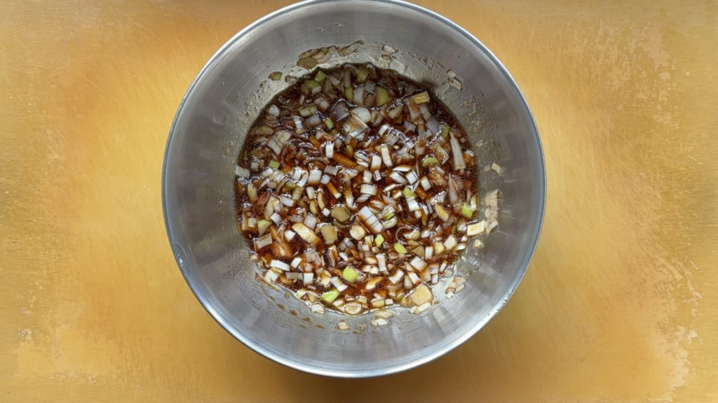 ボウルに醤油、酒、ごま油、フラクトオリゴ糖、一味唐辛子、ネギ、にんにく、しょうがを入れ、混ぜ合わせて合わせ調味料を作る
