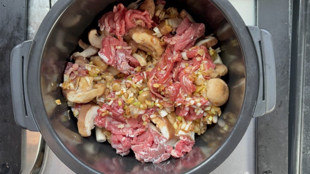 牛肉、合わせ調味料を入れ、軽くかき混ぜる