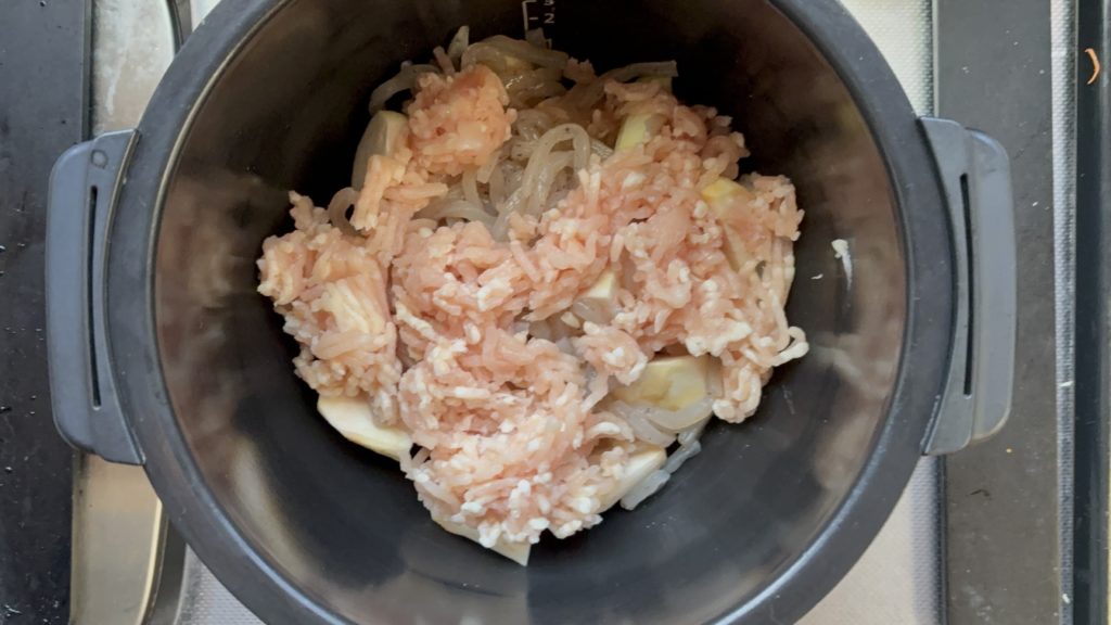 鍋に里芋、こんにゃく、鶏ひき肉の順に入れる