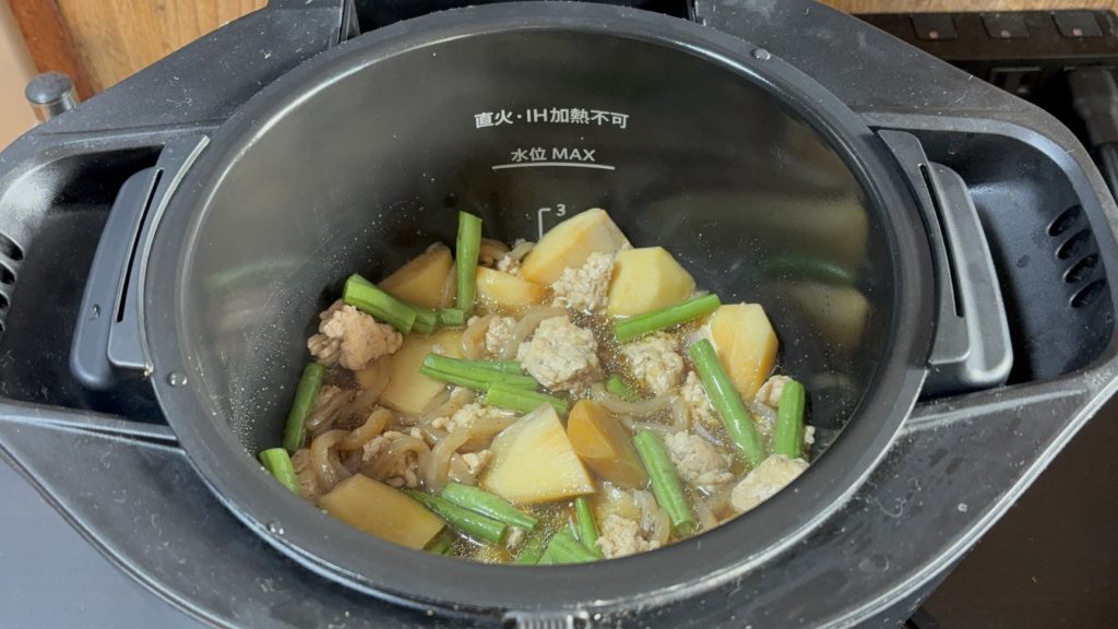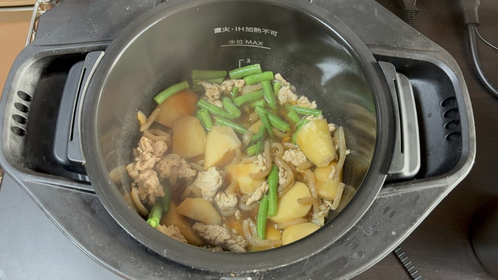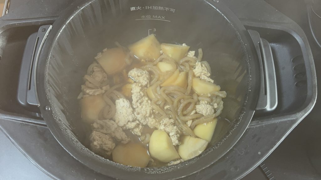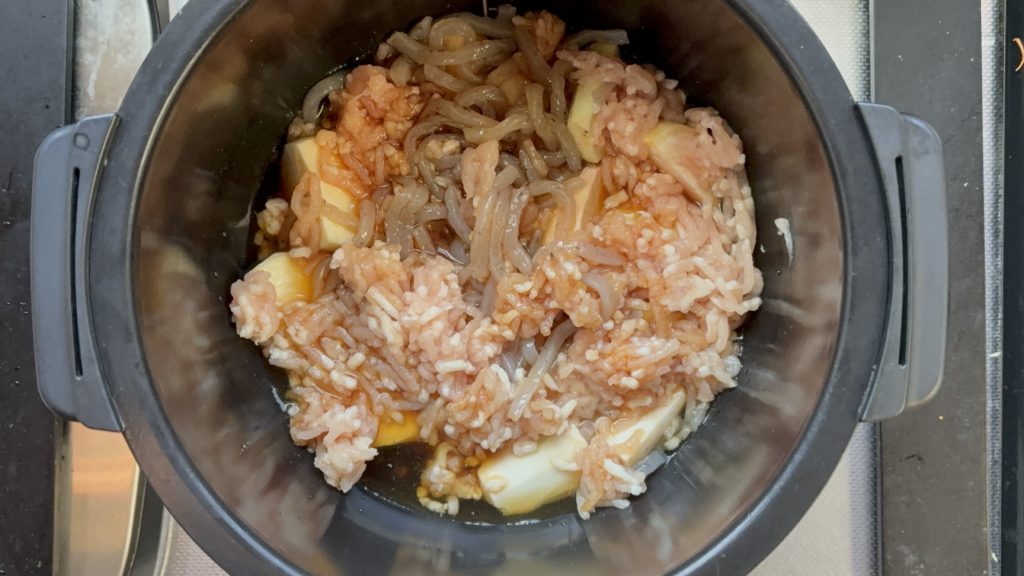 全体の調理時間は40分ほどかかります。材料の下ごしらえに10分、ホットクックの加熱に30分ほどです。