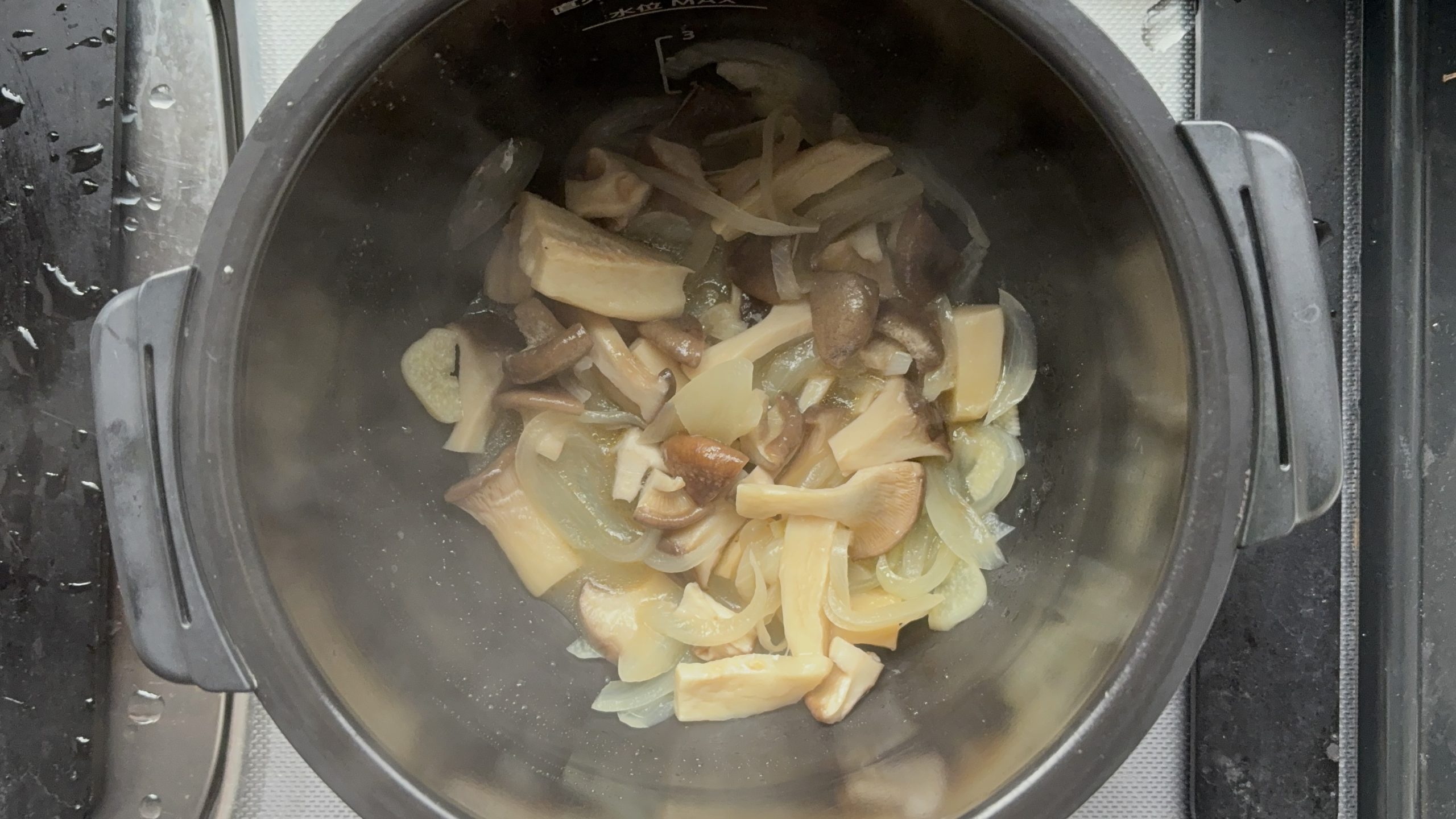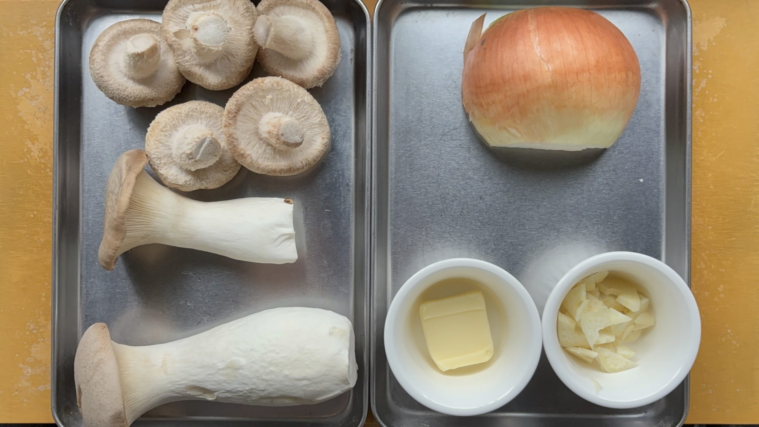 鍋にバター、にんにく、玉ねぎ、エリンギ、しいたけの順に入れる