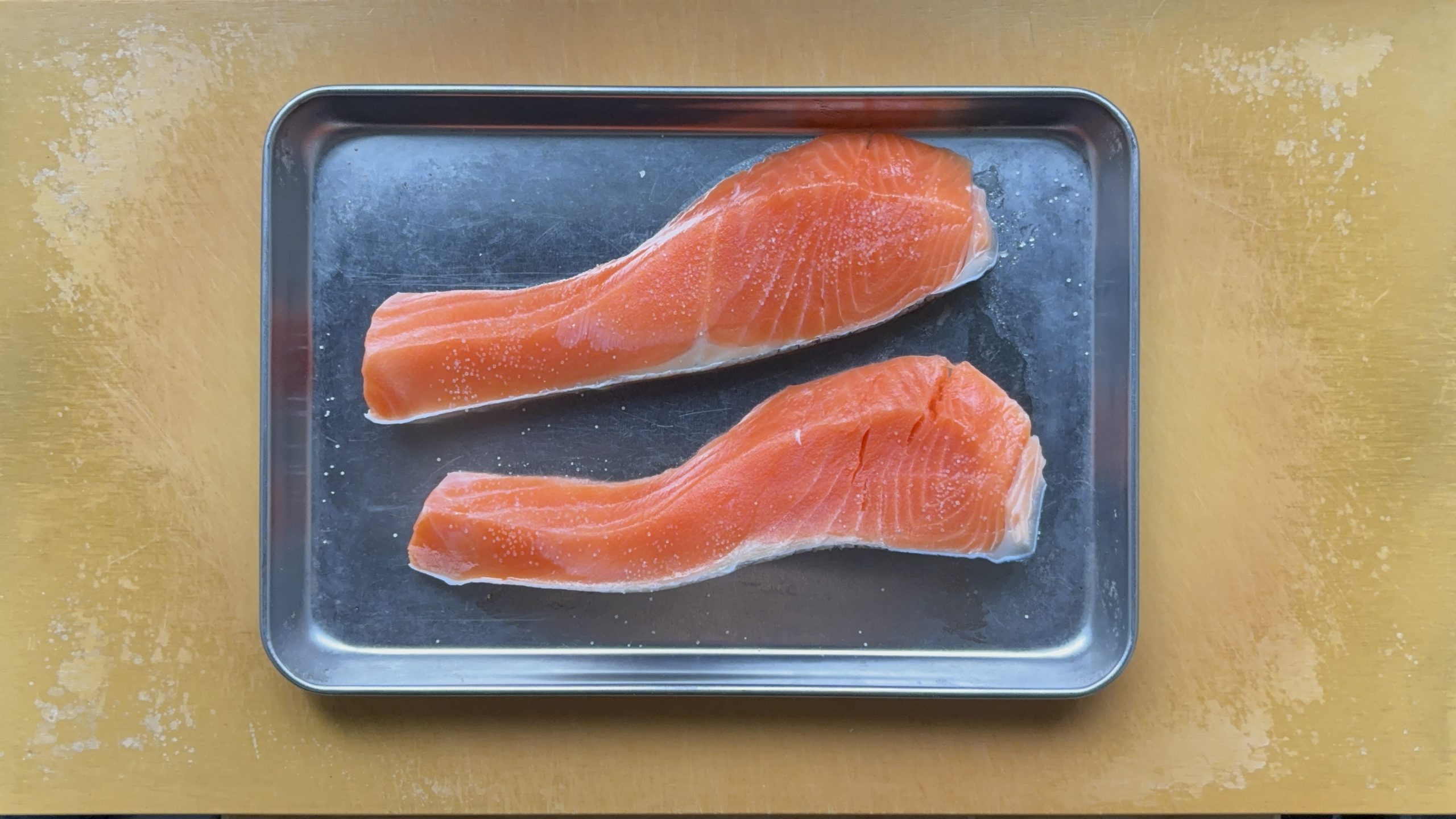 秋鮭に塩をまぶし、10分ほど置いて水気を拭き取ります。