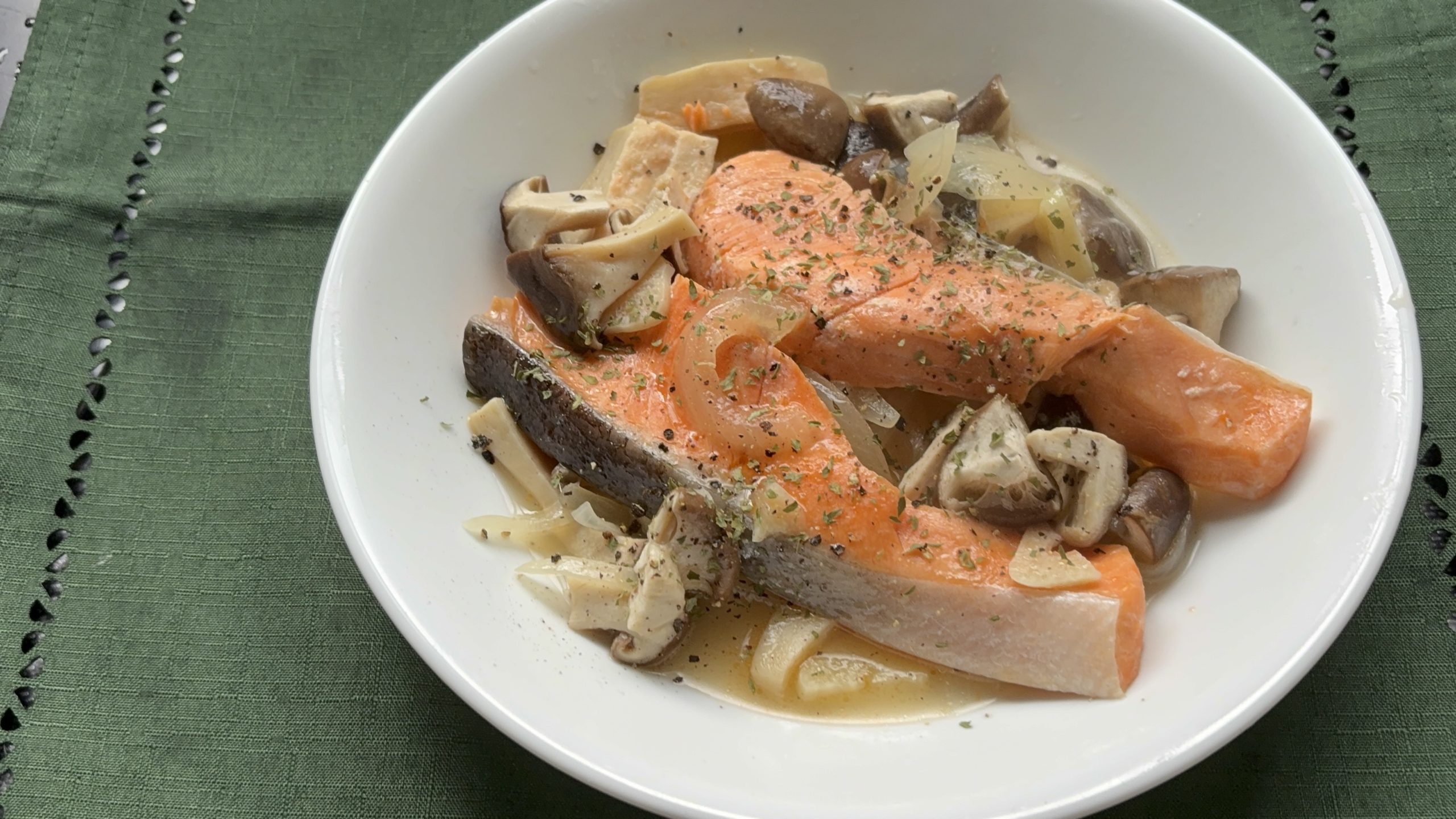 ふっくらとした鮭と、ぷりっとしたエリンギ、やわらかいしいたけが絶妙なコントラスト。