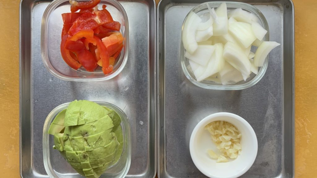 ぷりぷりのえびと玄米のプチプチ感、アボカドのとろけるような柔らかさが楽しい一皿。パプリカと玉ねぎのしゃきっと感がアクセントになり、噛むごとに異なる食感が広がります。