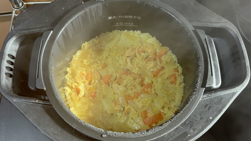 鍋に玄米、白ワイン、カレー粉、塩、2合の目盛りまで水を入れ、よくかき混ぜる