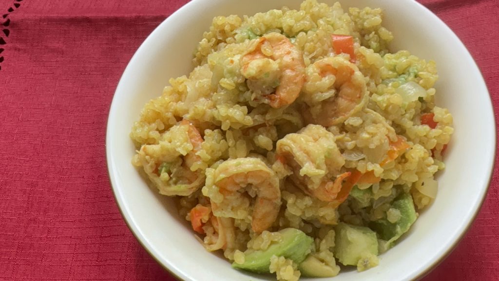 ぷりっとしたえびとクリーミーなアボカドが香る、スパイシーな玄米の炊き込みご飯です。