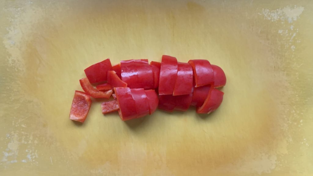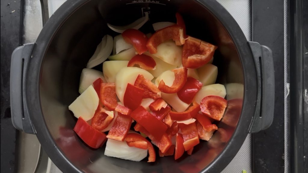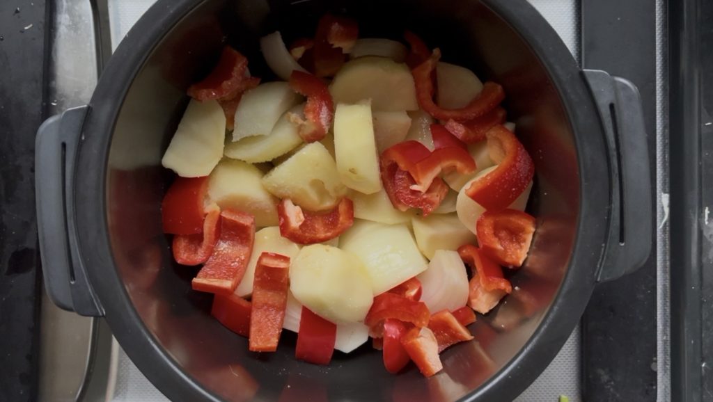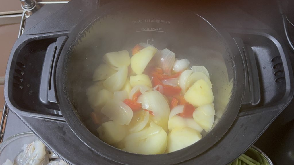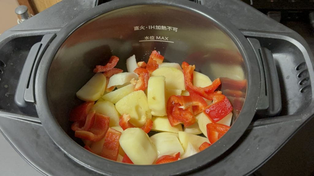 鍋に玉ねぎ、じゃがいも、赤パプリカの順に入れる。