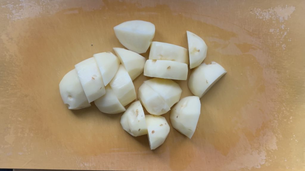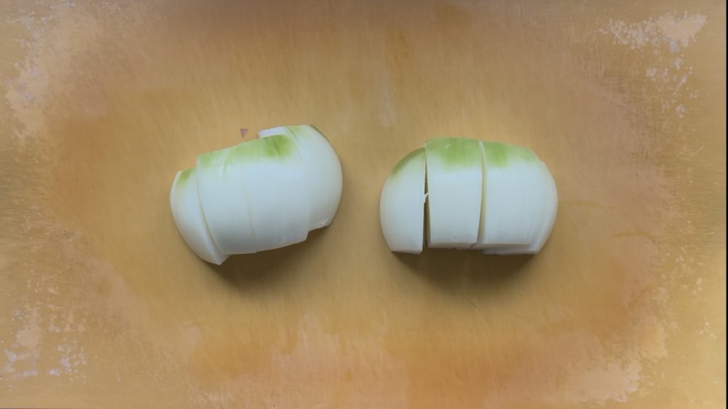 玉ねぎは縦半分に切り、4等分のくし形切りにする。