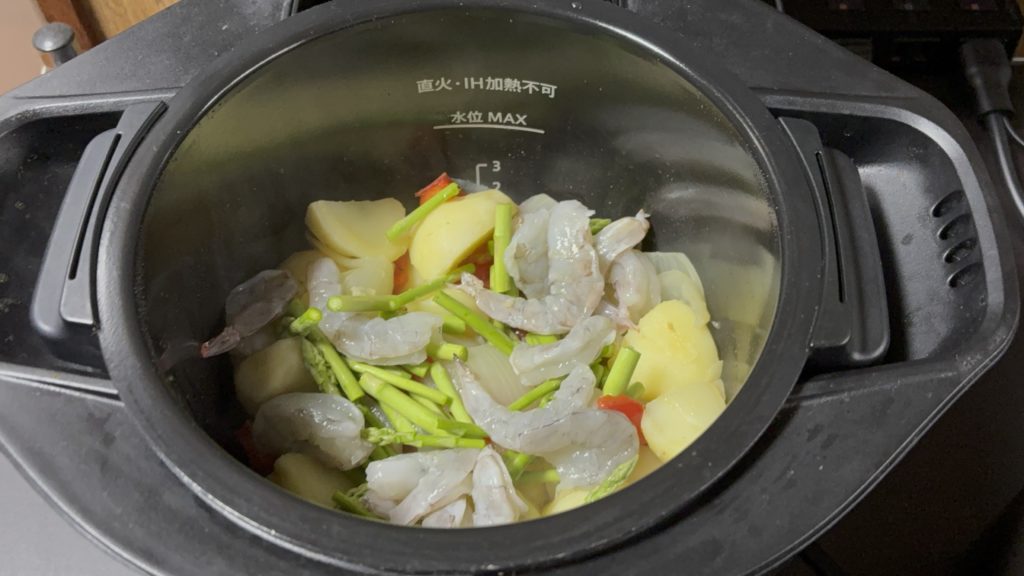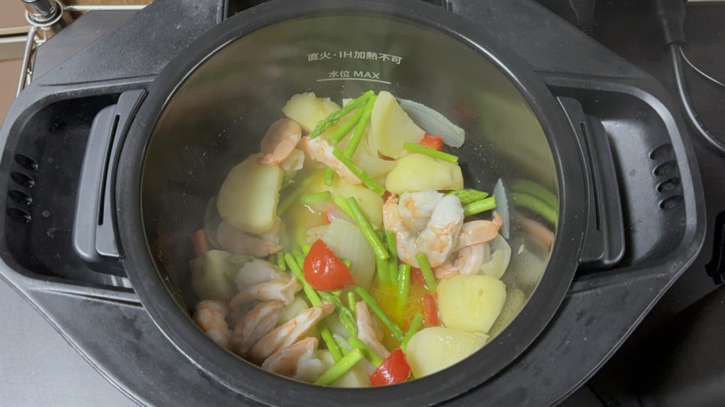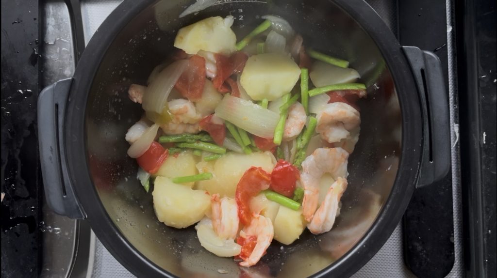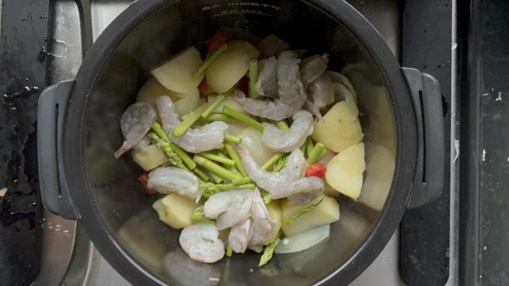 4.調理終了の5分前に、アスパラ、海老を鍋に加え調理再開