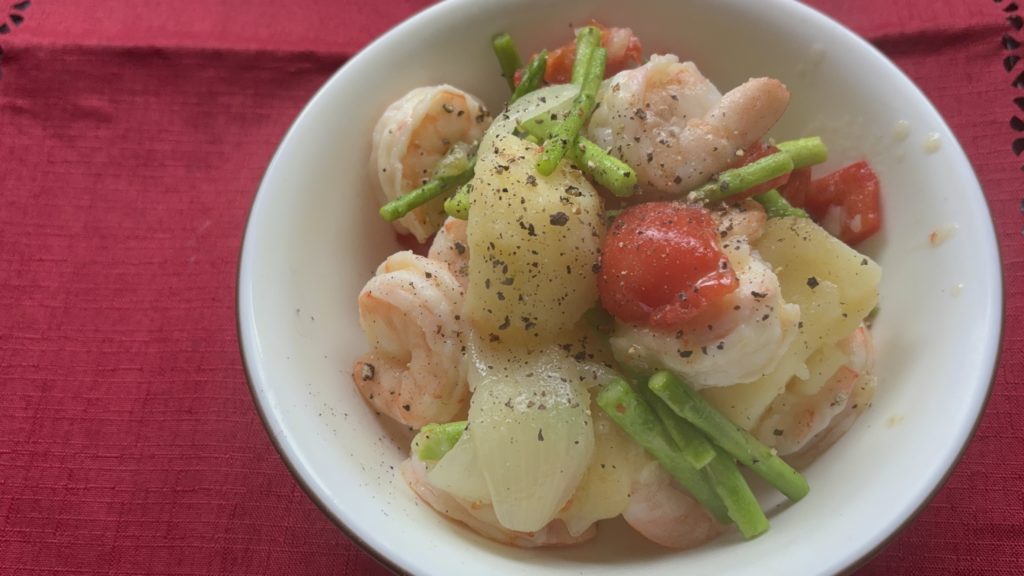 えびの旨味とオリーブオイルのコクがじゃがいもや野菜にしっかりと行き渡り、塩だけのシンプルな味付けでも深い味わい。パプリカの甘みとえびの塩気のバランスが絶妙で、最後にふるブラックペッパーが全体を引き締めます。