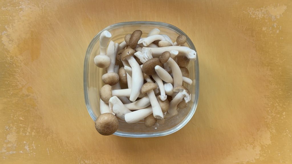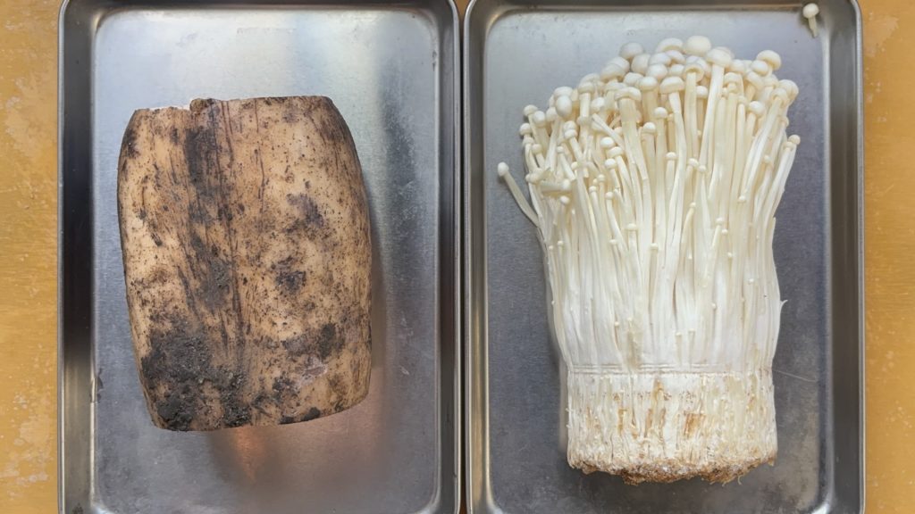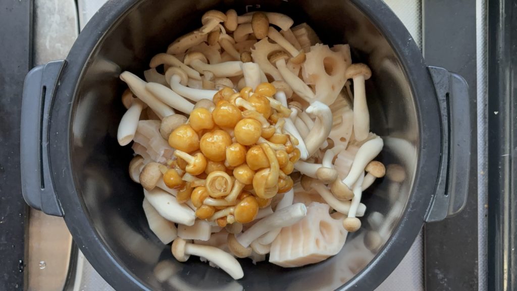 鍋にえのき、れんこん、しめじ、なめこの順に入れる