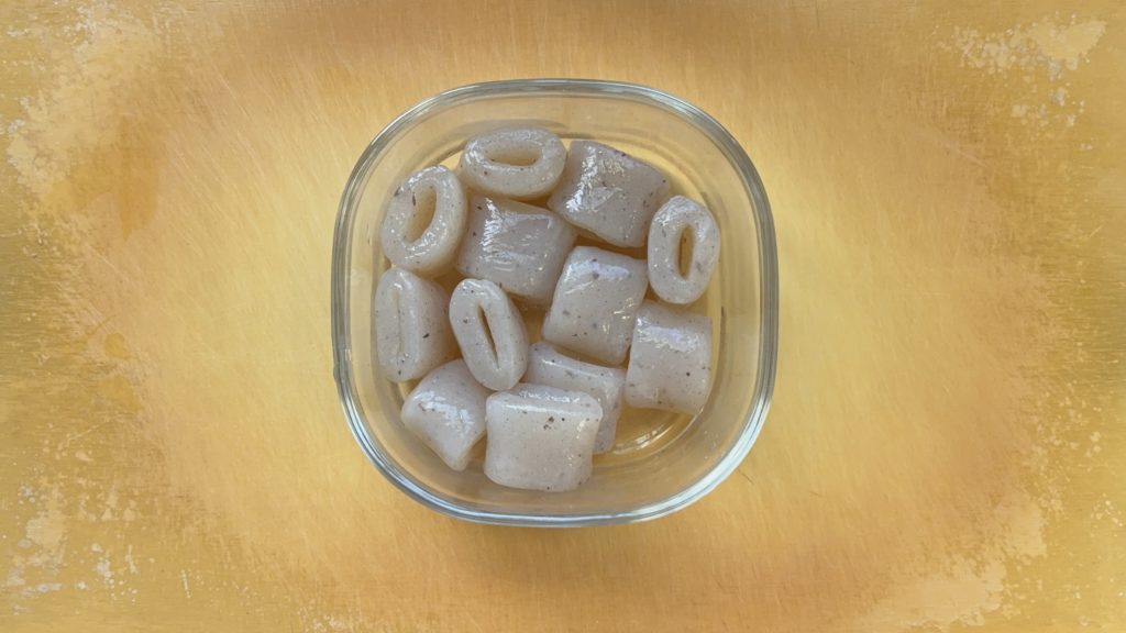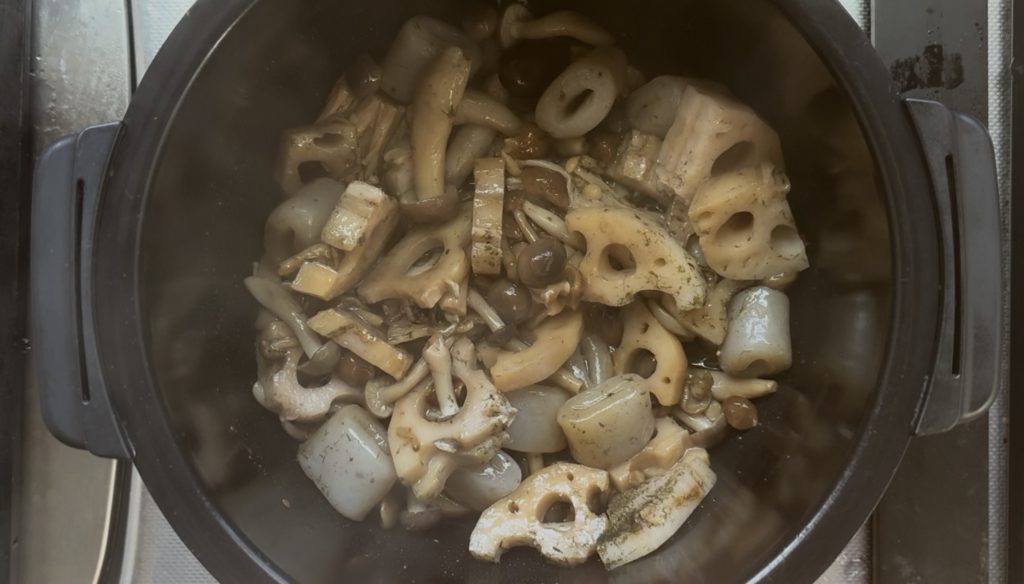 れんこんの白、しめじやえのきの淡い色合い、こんにゃくのグレーが優しいトーンでまとまり、青のりの緑が美しいアクセントになります。素朴ながらも上品で、食卓に落ち着きを添える見た目です。