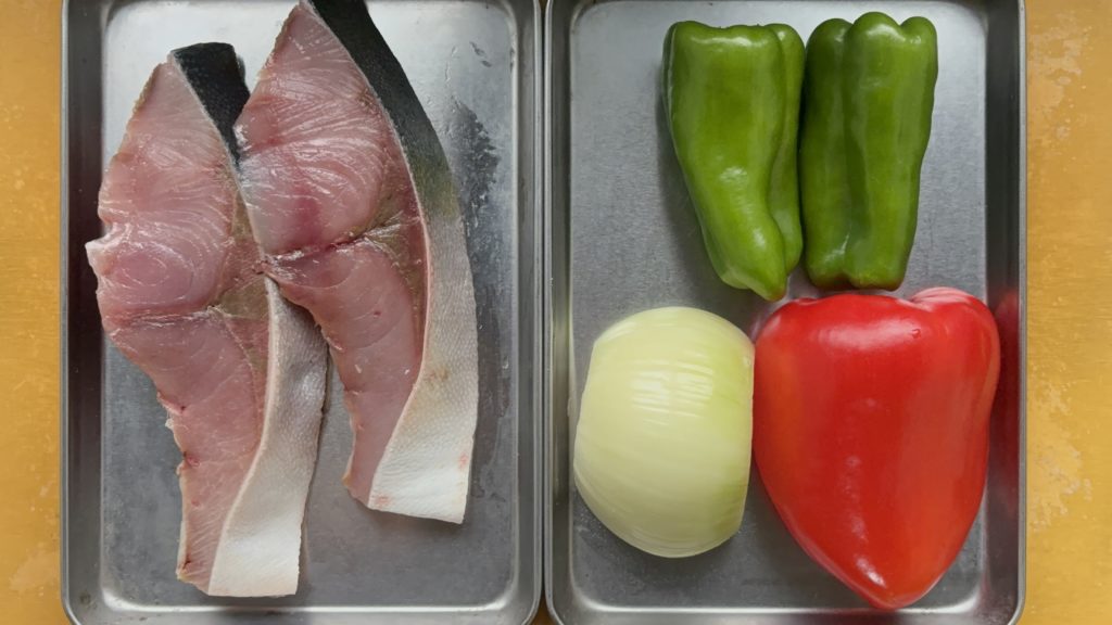 鍋に玉ねぎ、パプリカ、ピーマン、ぶりの順に入れる