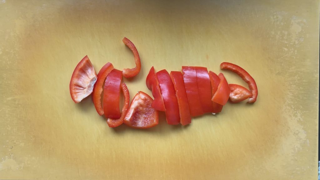 赤パプリカは縦半分に切ってから横1cm幅に切る