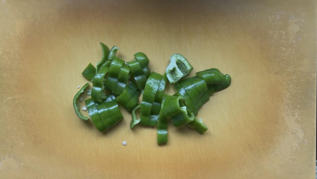 ピーマンは縦半分に切ってから横1cm幅に切る