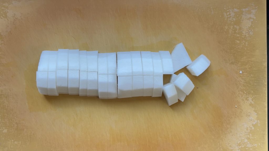 大根は厚めに皮を剥き、1cm幅のいちょう切りにする